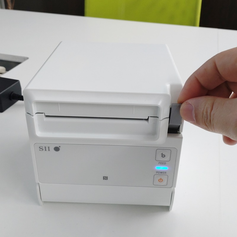 ①レシートプリンタをACアダプターと接続し電源を投入します。