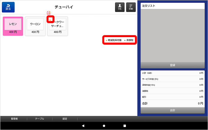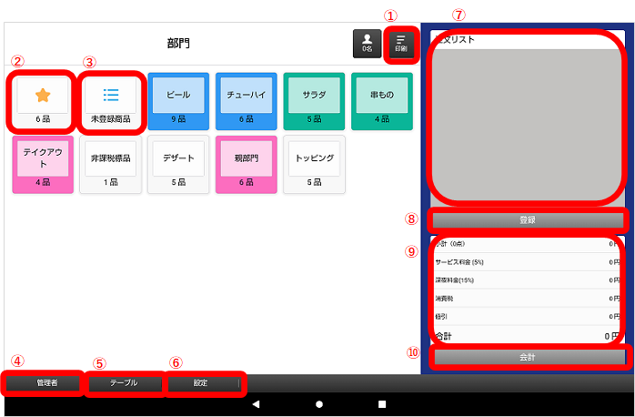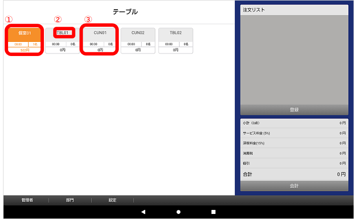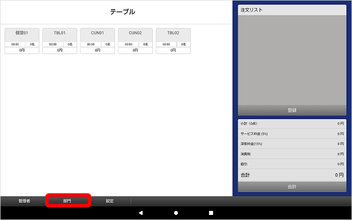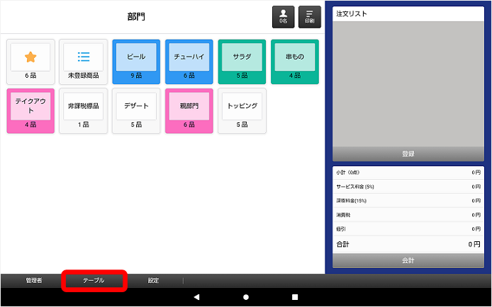 ①タブレット画面で、画面下の「テーブル」か「部門」をタッチします。