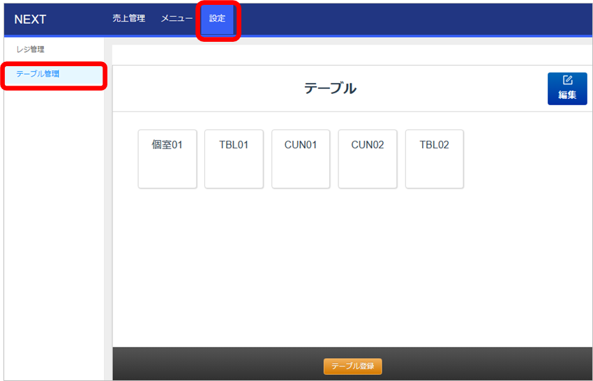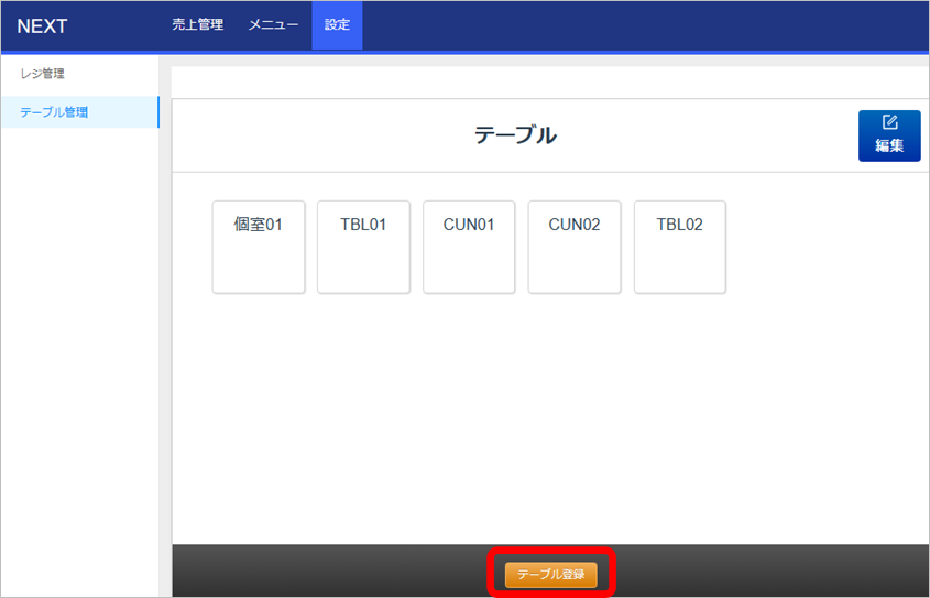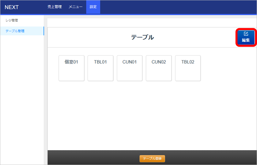 ①テーブルを新規作成時は、「テーブル登録」キーを押下します。