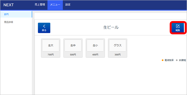 ①商品を変更する部門画面で、「編集」をクリックする。(新規登録処理と同じです)