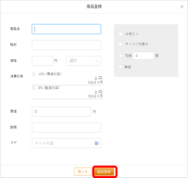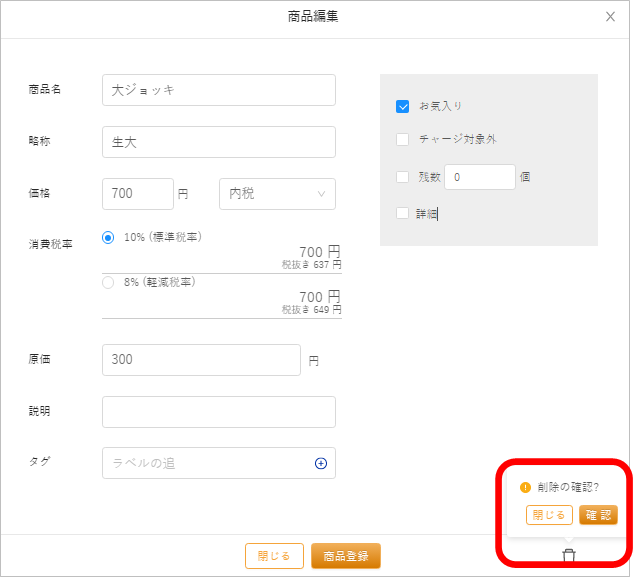 ・略称(任意):必要に応じて商品の略称を入力します。略称が入力されている商品は、注文時のパネルに略称が表示されます。