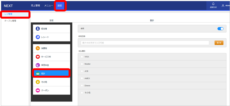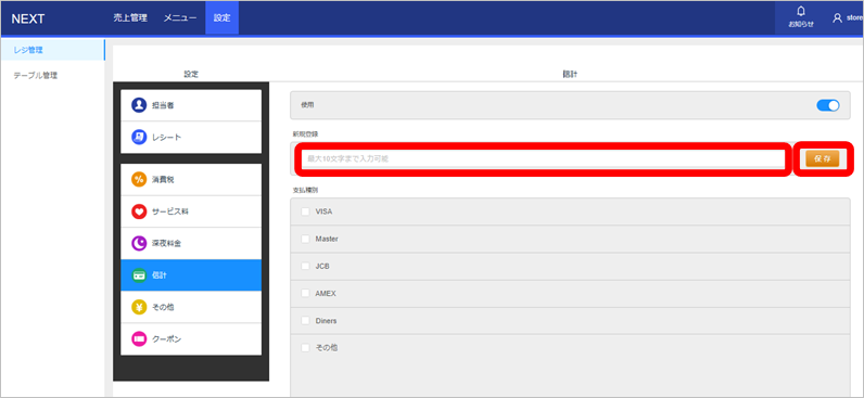 会計時に使用できるクレジットカードの種類の設定行なうことが可能です。