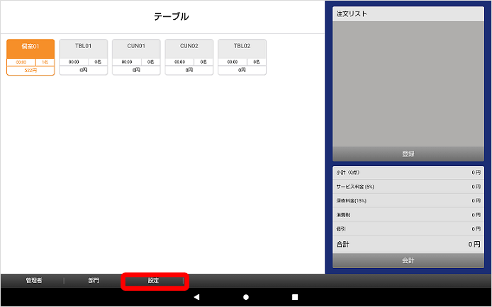 ①タブレット画面下の「設定」キーをタッチ、「タイマー」をタッチします。