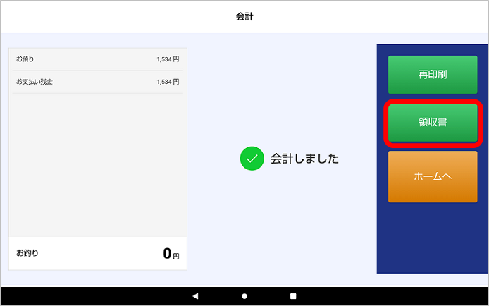 ①会計処理終了画面または分割会計終了画面の、「領収書」キーから発行可能です。