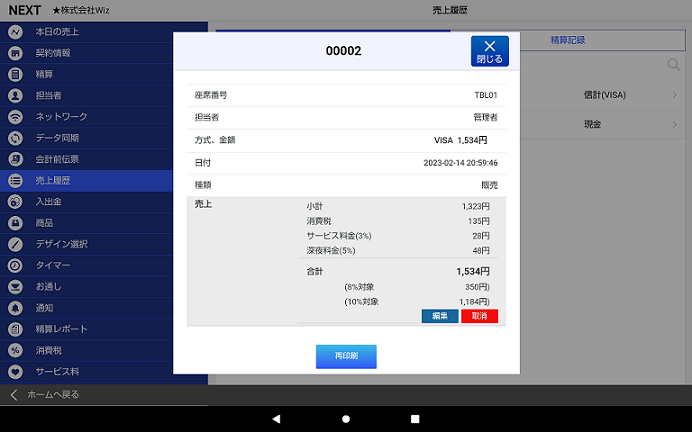 ②「設定」ー「売上履歴」から、対象取引を選択し、「再選択」ー「領収書」キーから(再)発行可能です。