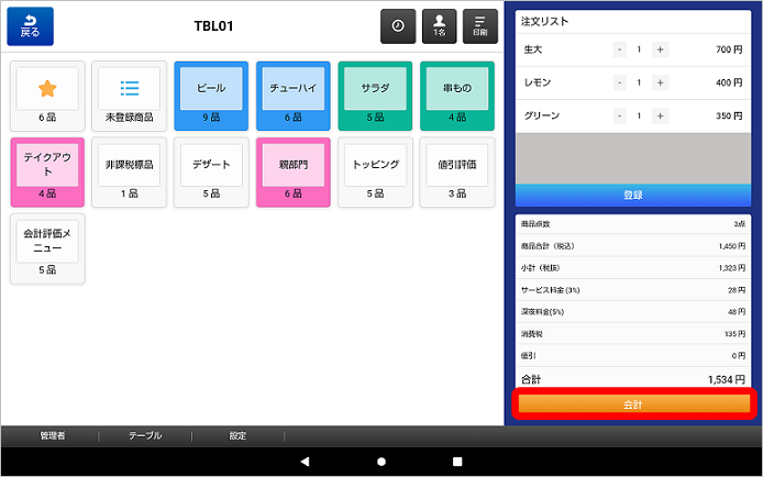 ①注文が全て終了し、会計を行う場合「会計」キーをタッチします。