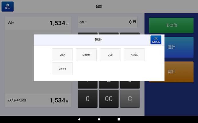 す)。「信計」キーをタッチすると、クレジットカード選択画面が表示されますので、利用するものをタッチ