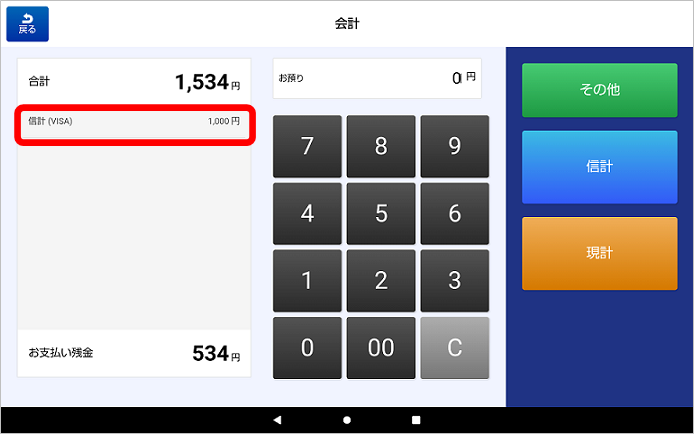 ②クレジットカードで支払う場合、金額+「信計」キーをタッチします(全額の場合は、金額入力は不要で