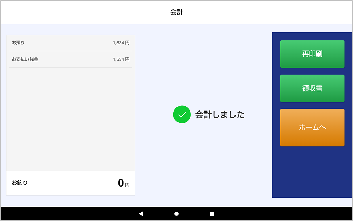 ⑤支配が完了すると、会計終了画面を表示し、レシートを印刷します。
